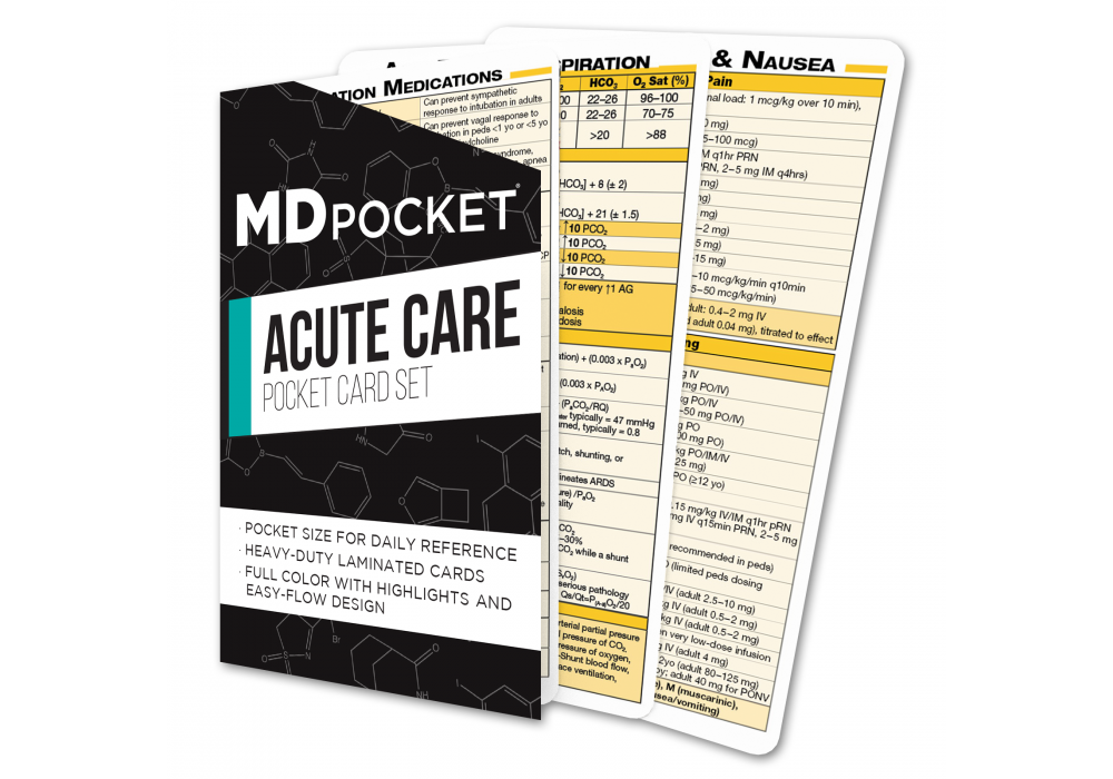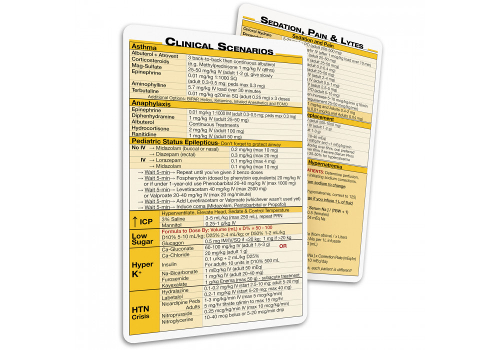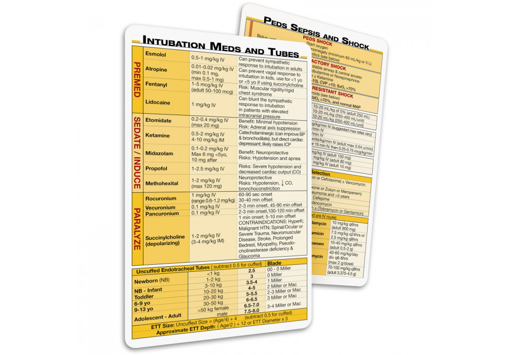 These cards will improve your practical bedside knowledge without wasting time searching for acute and critical care guidelines. Use these pocket card references for resuscitation guidelines, intubation medications, endotracheal tube sizes, andidotes and much more. These cards have been tried and tested by training programs at the University of Michigan, Medical College of Wisconsin, and the University of Wisconsin. Healthcare providers that have also used these cards include hospitalists, pediatricians, anesthesiology residents, fellows in critical care, and emergency medicine physicians. A must have pocket medical reference card set for anyone in critical care.